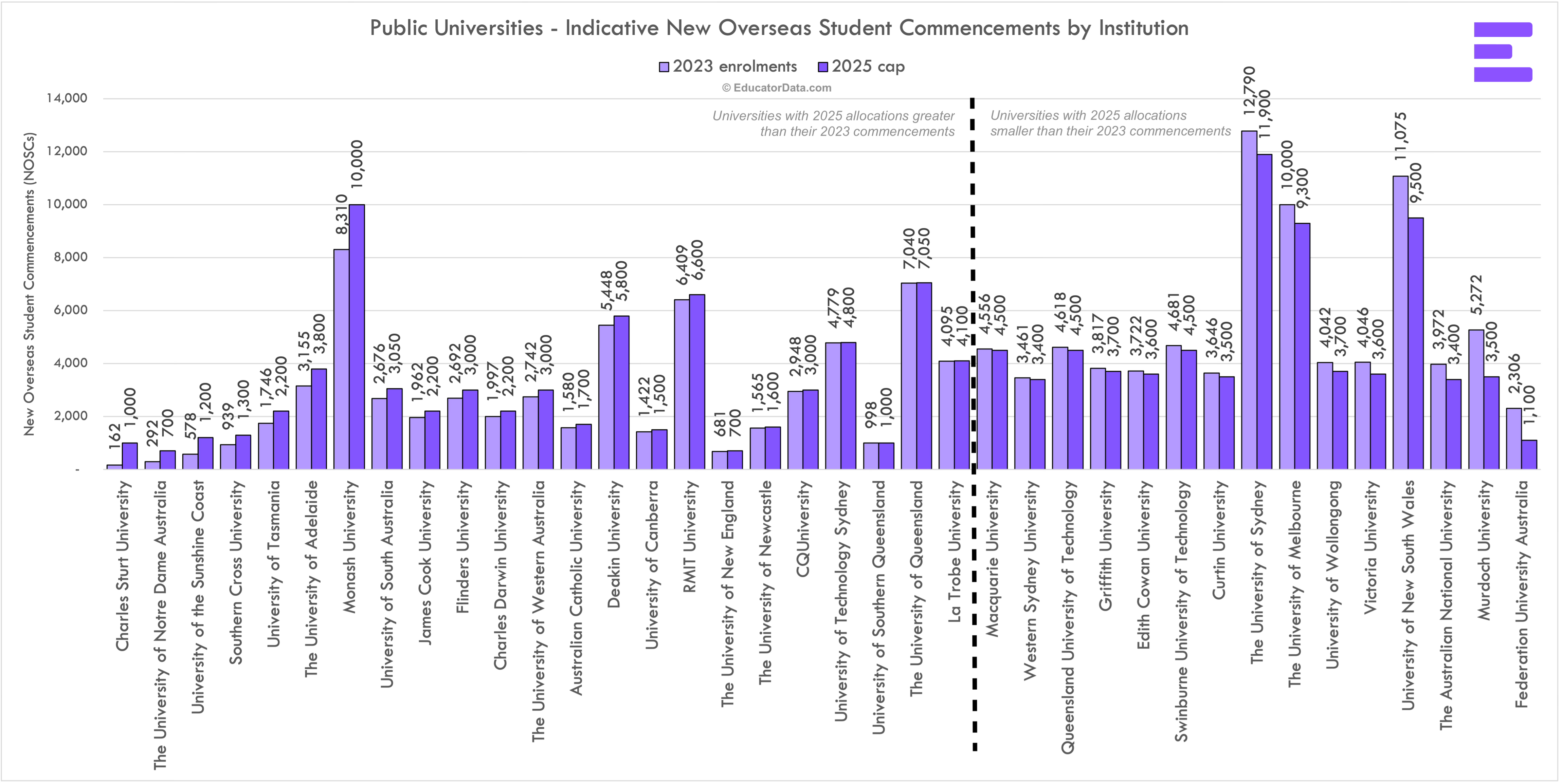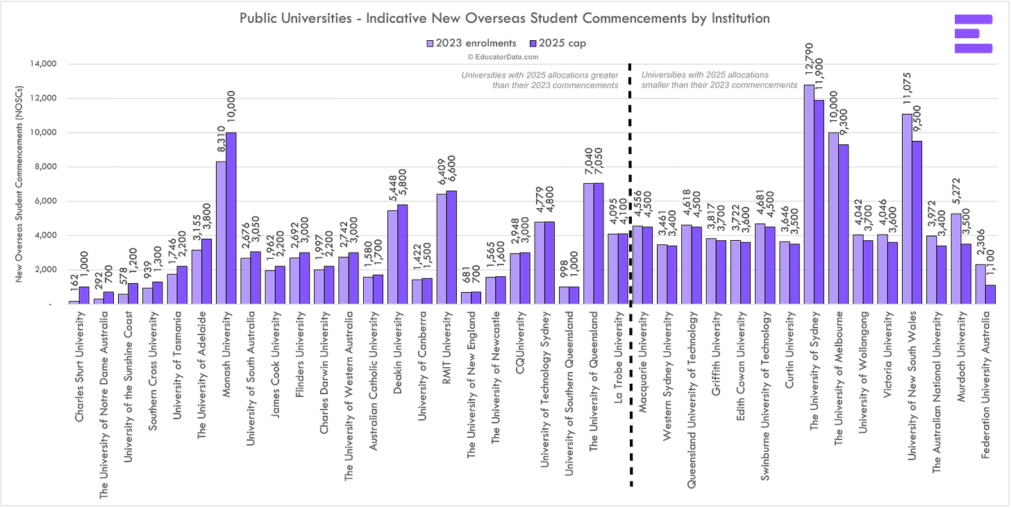 How many international students does each university get in 2025?