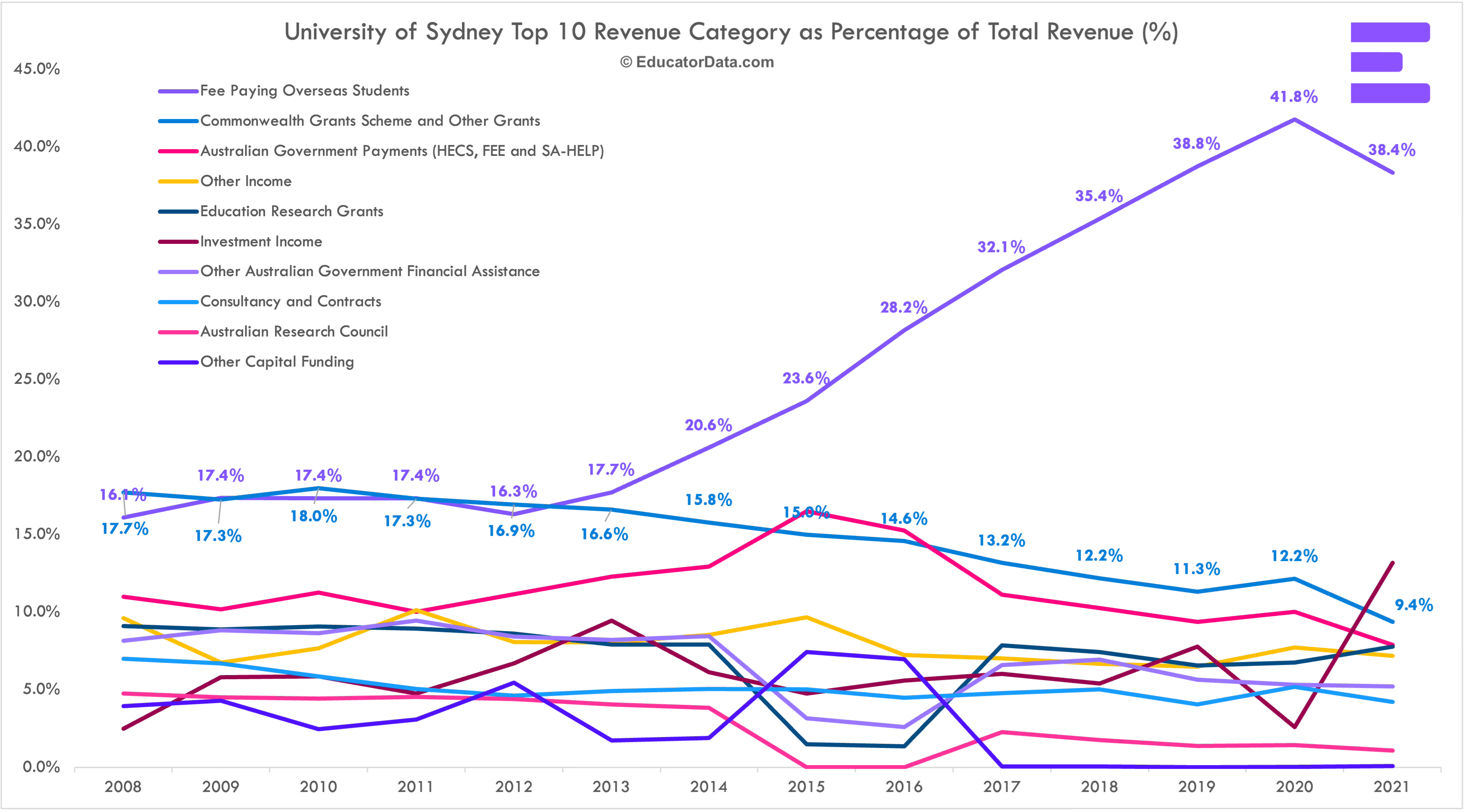 In 2021, revenues from fee paying international students, Commonwealth Grants Scheme and Australian Government Payments (HECS, FEE and SA-HELP) accounted for 38.4%, 9.4% and 7.9% of total revenue for University of Sydney respectively.