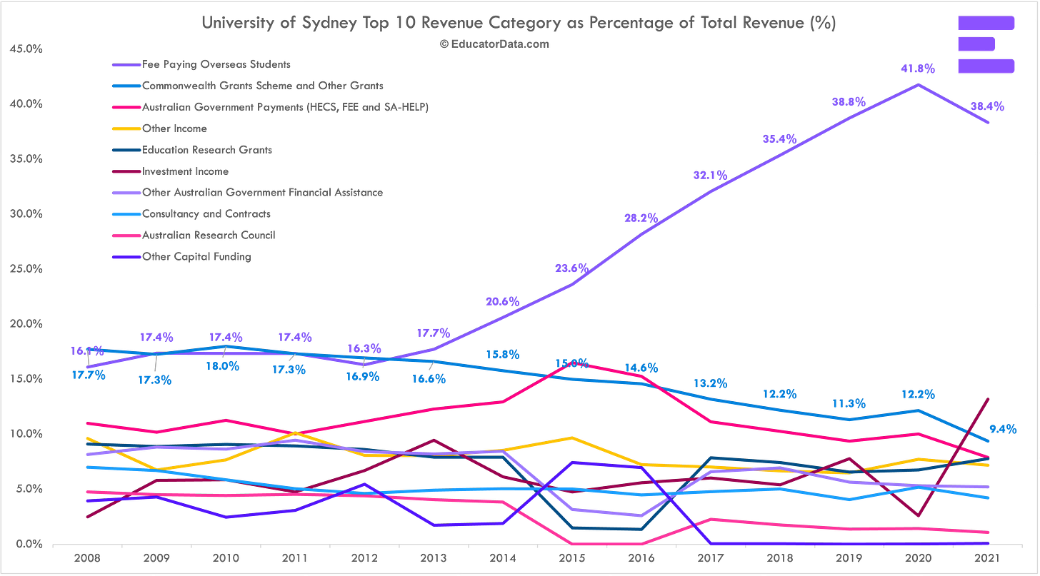 Between 2013 to 2021, University of Sydney was growing at 16.8% CAGR on revenue from international students.
